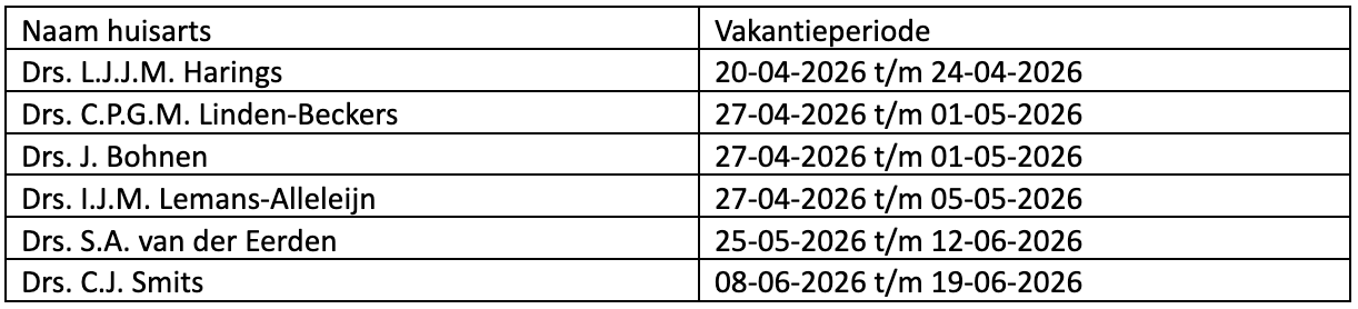 In onderstaand overzicht hebben wij weergegeven wanneer de artsen met vakantie zijn.